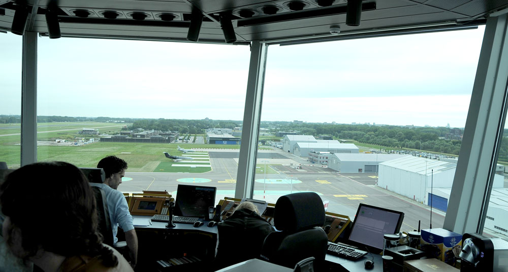Vanuit de toren is alles perfect te volgen. Leuk detail: de luchtverkeersleider spot vliegtuigen met het blote oog, terwijl het voor mij nog nauwelijks zichtbare stipjes aan de horizon zijn.
